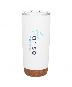 20 Oz. double wall 18/8 stainless steel thermal tumbler with copper vacuum insulation, clear push-on lid with sliding closure, and synthetic cork base. Individual gift box. Hand wash recommended. Do not microwave. Complies with FDA, Prop 65. 7.625" H x 3.5" W