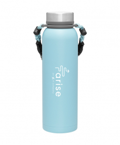 32 oz double wall 18/8 stainless steel thermal bottle with copper vacuum insulation, insulated stainless steel threaded lid, silicone ring, removable strap with buckles, removable clasps, and powder coated finish. Individual gift box. Hand wash recommended. Do not microwave. Complies with FDA, Prop 65. 11" H x 3.1875" W